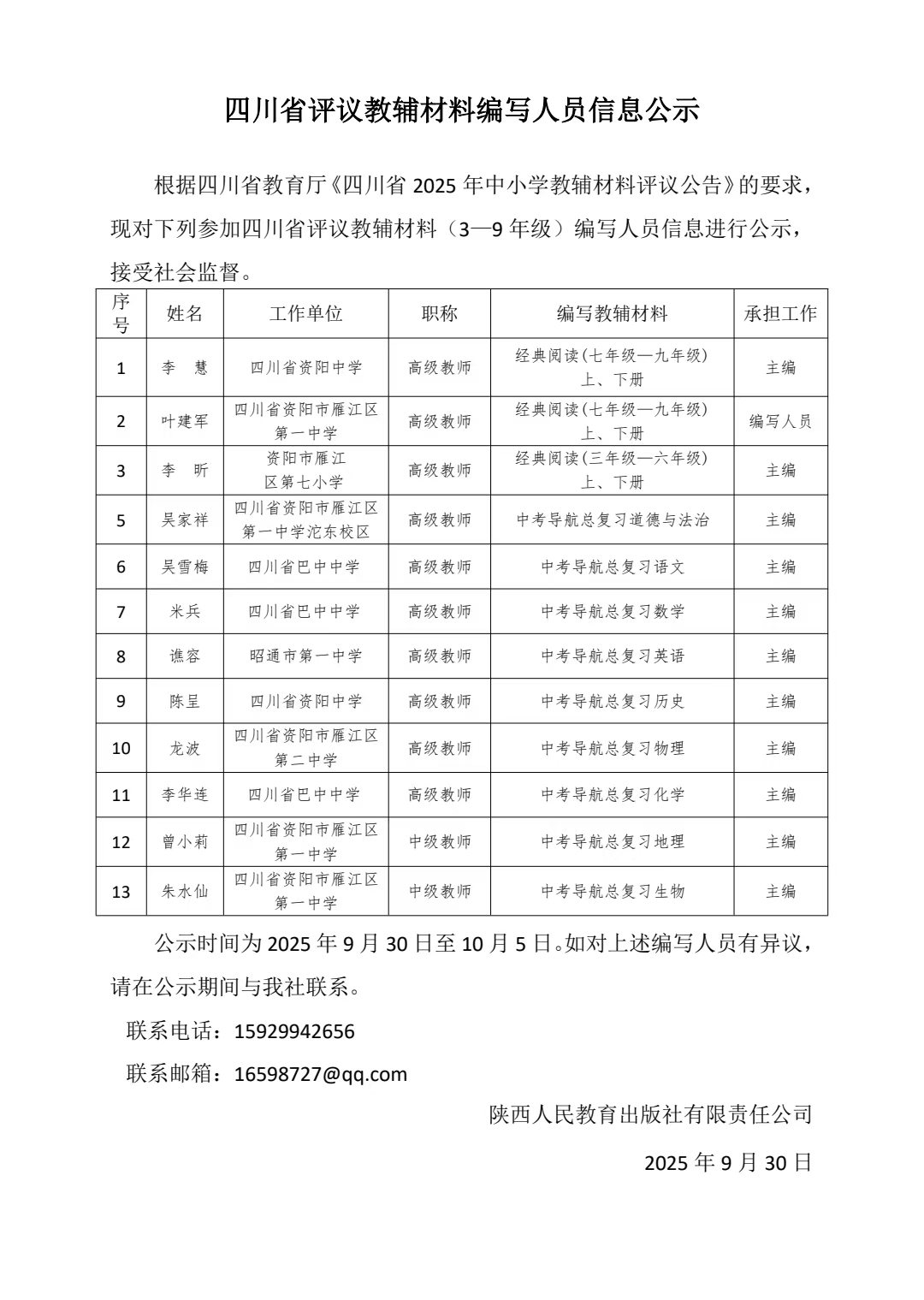 四川省评议教辅材料编写人员信息公示